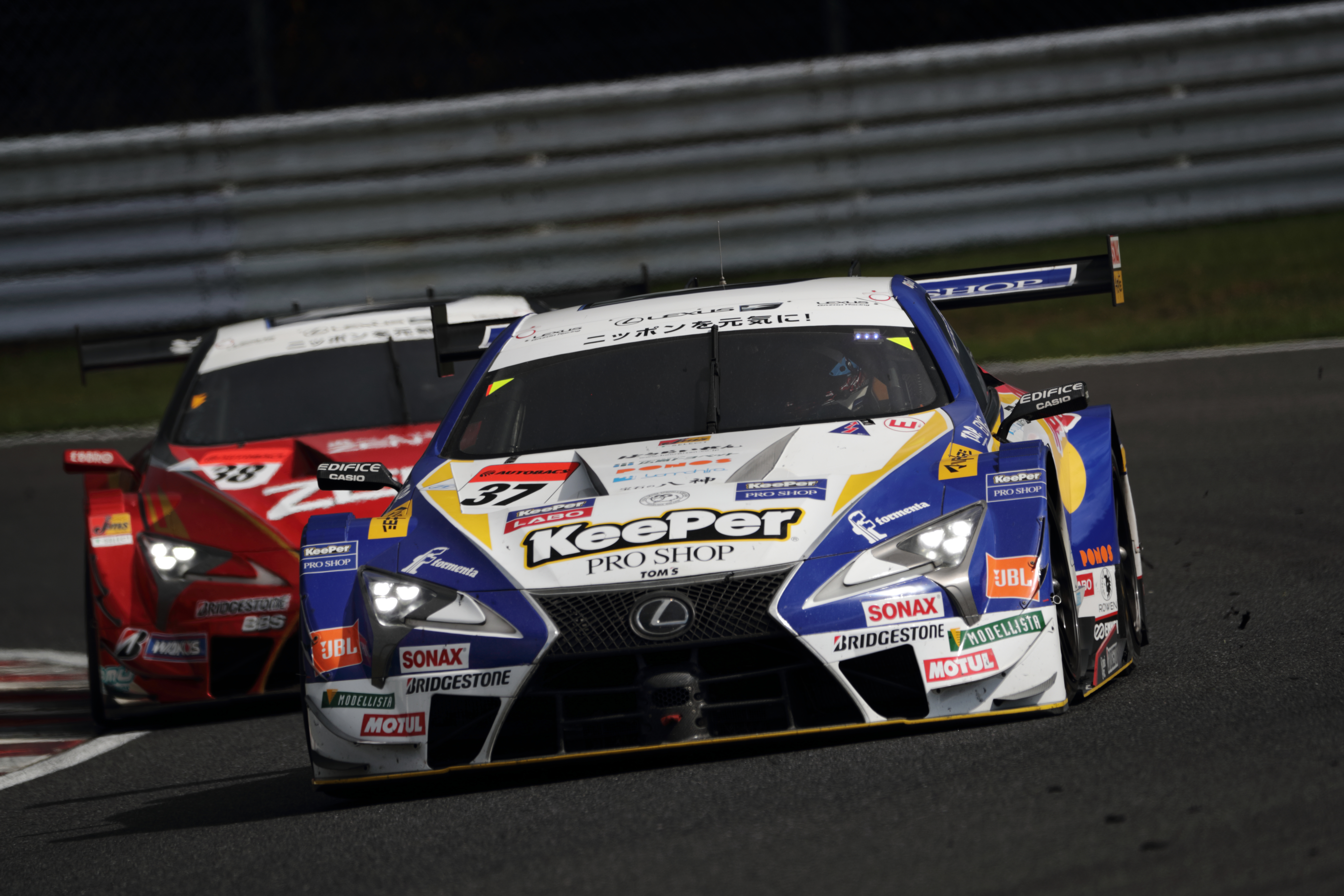 周回時にコース全体に雨が降り始める、まだ完全にウエット路面にはなっていないが、ライバル勢はこのタイミングで一斉にピットイン、タイヤをウエットタイヤに交換するマシンが多いが雨の勢いはそれほど強くなく、KeePer37号車はドライタイヤでのステイを選択した。